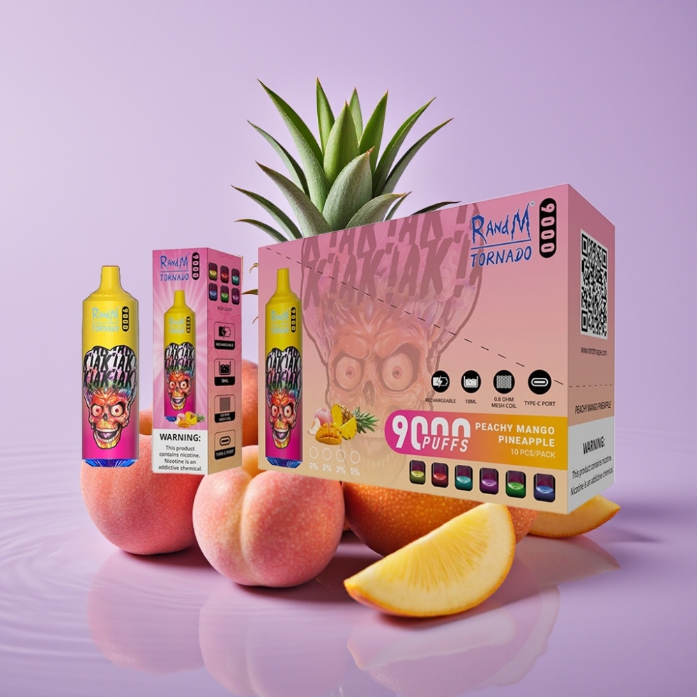 RandM Fumot Tornado 9000 نفخة بنكهة الخوخ والمانجو والأناناس - 18 مل، شاشة إل إي دي، 850 مللي أمبير
